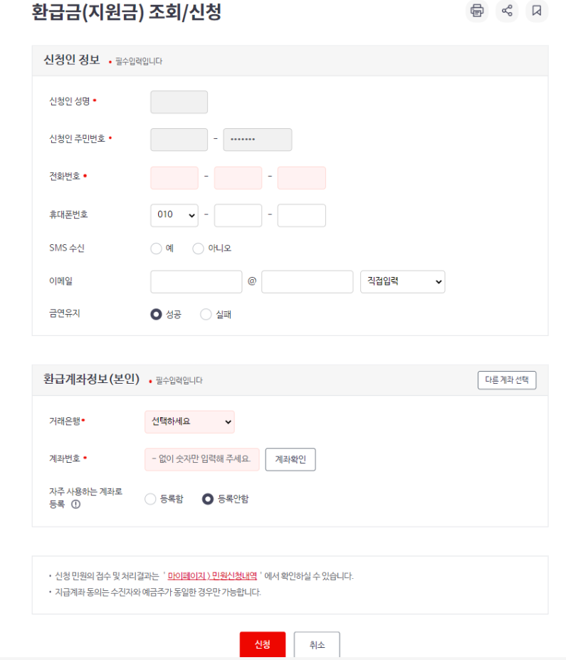 건강보험료 환급 신청 시 개인정보를 정확하게 입력하셔야 합니다. 개인정보를 잘못 입력한 경우 환불이 불가능하오니, 신청 전 개인정보를 확인하시고 필요한 경우 수정하시기 바랍니다.