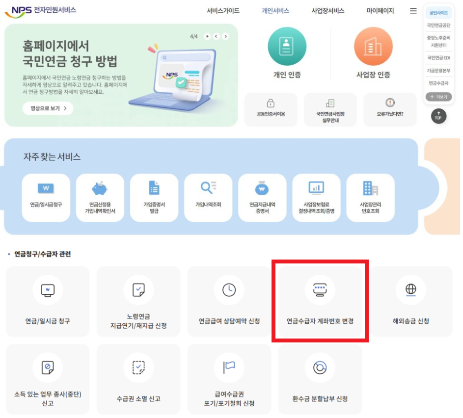 국민연금 계좌를 변경하는 방법두 번째, 급여계좌 변경 방법은 국민연금 홈페이지에 접속하여 직접 변경하는 것입니다. 기다리지 않고 원할 때 언제든지 변경할 수 있다는 장점이 있습니다.
