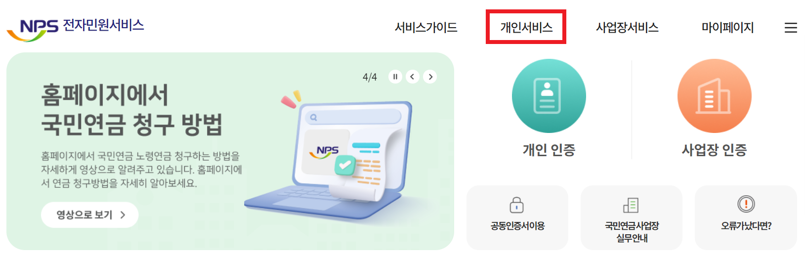 ○ 상단 메뉴에서 개인 서비스 선택하다