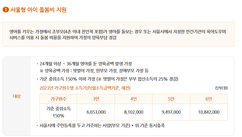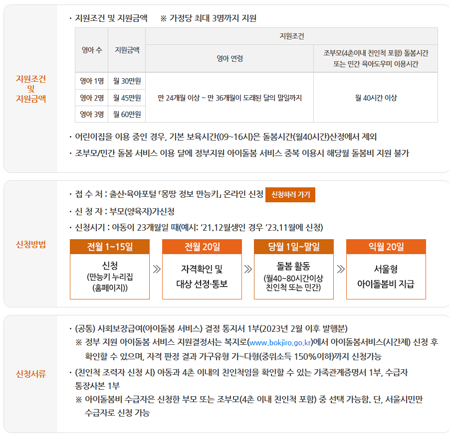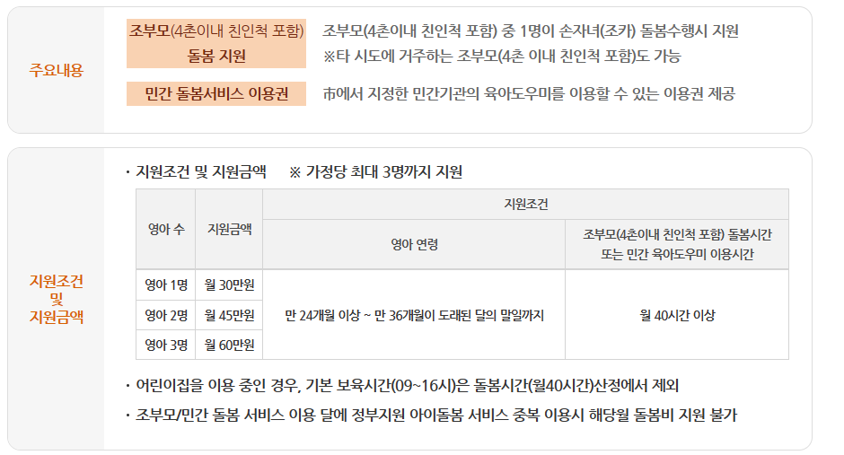 이중 양육으로 인해 서비스 후견인이 없는 24개월~36개월 미만의 자녀를 양육하는 가구입니다. 소득. 아동은 생후 23개월이 되는 달에 지원을 신청할 수 있으며 지원금액은 13개월 이하의 대상연령 아동 1인당 월 30만원이다.