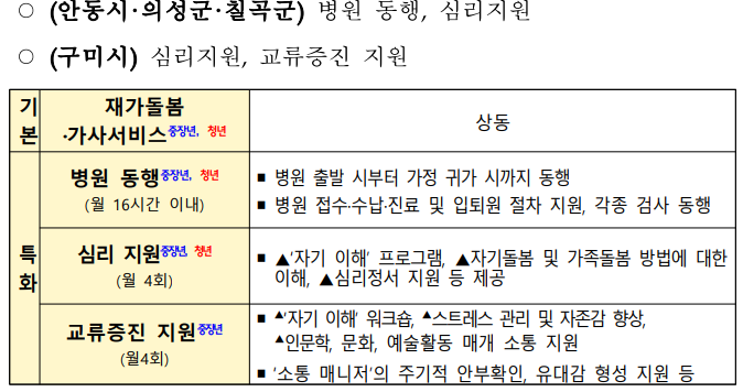 ▣ 경상북도 안동시, 구미시, 의성군, 칠곡군 (가정 돌봄을 받는 중장년층, 청년층 대상)