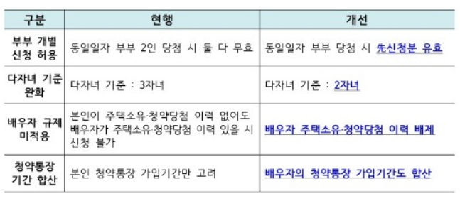 ▶ 다자녀 기준 완화 : 기존 3자녀에서 인정되던 다자녀 기준을 2자녀로 완화합니다.
