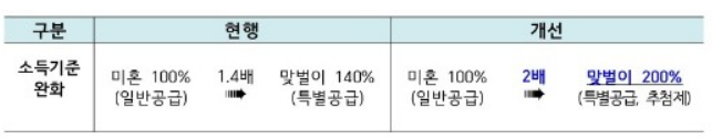 기존 2인 가구 소득기준이 1인 가구 소득기준의 2배보다 낮아, 복권제도를 마련해 월평균 소득을 200%로 올려 맞벌이의 불리함을 해소했다. 신혼부부.