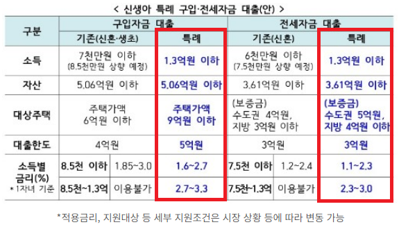 위에서 간략히 설명한 바와 같이 기존 대출과 신규 특별대출의 가장 큰 차이점은 소득 비중이 2배 정도 늘어났다는 점이다. 미혼(6000만 원)과 신혼(8500만 원)의 기존 소득에는 큰 차이가 없어 기혼자가 더 불리할 것이라고 들었으나, 특별대출의 경우 소득에 있어서는 뚜렷한 차별이 있었다. 신생아. 예.