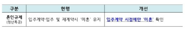 공공지원 민간임대주택 청년특약 당첨 시 입주기간 동안 미혼이어야 한다는 불합리한 조건을 입주계약 당시 미혼인 사람만 허용하도록 변경됐다.