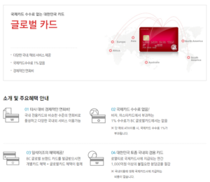 - 추천이유 : 전월 실적조건 없는 카드 중 해외사용 할인율이 가장 높은 카드입니다. 해외에서 카드 사용 시 1.5% 할인을 받을 수 있어 해외여행을 자주 다니는 분들에게 추천합니다. 또한, 온라인쇼핑, 편의점, 커피숍, 대중교통 등에서 1.5% 할인을 받을 수 있어 일상생활 속에서도 혜택을 누릴 수 있습니다.