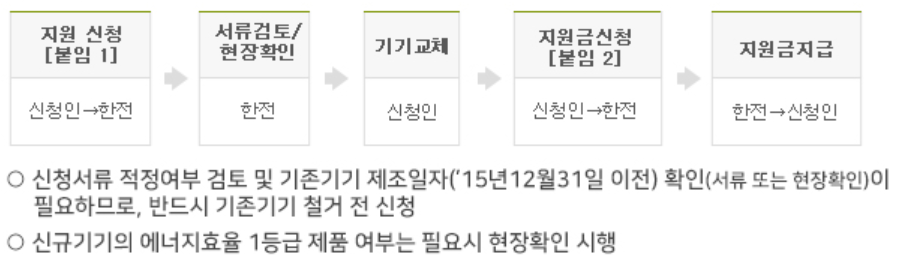 우선, 귀하의 사업장에 있는 기존 제품이 2015년 이전에 생산된 제품이고 이를 교체할 계획이라면 먼저 한전에 교체지원 신청서를 제출해야 합니다. 서류 검토 후 한전이 현장을 방문하여 검토하고 승인되면 제품을 교체하고 다시 보조금을 신청해 금액을 받는다.